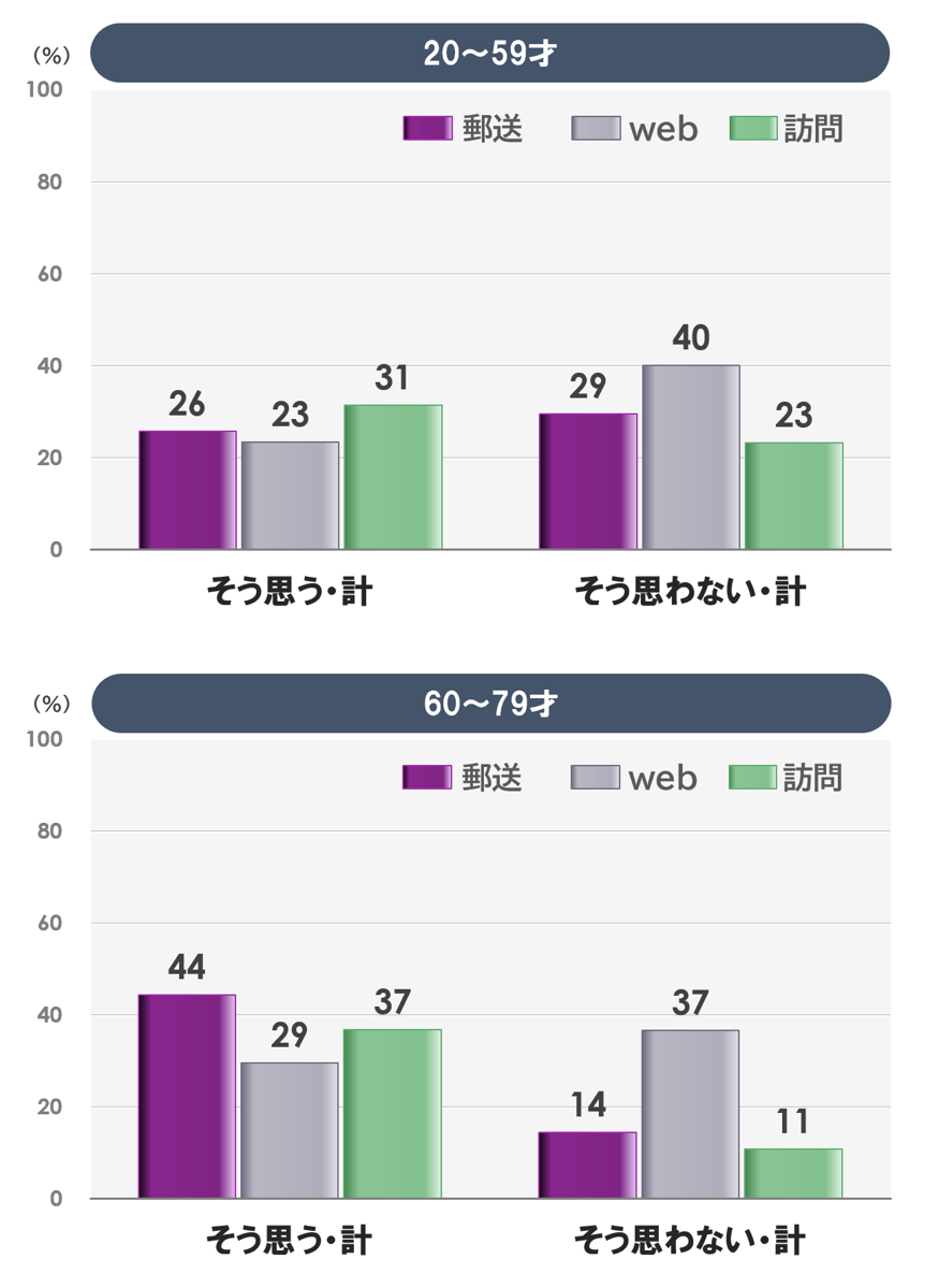 ・「郵送」と「訪問」では、肯定と否定がほぼ同じか、肯定が否定を上回っているが、「web」では否定(そう思わない計)が多かった。