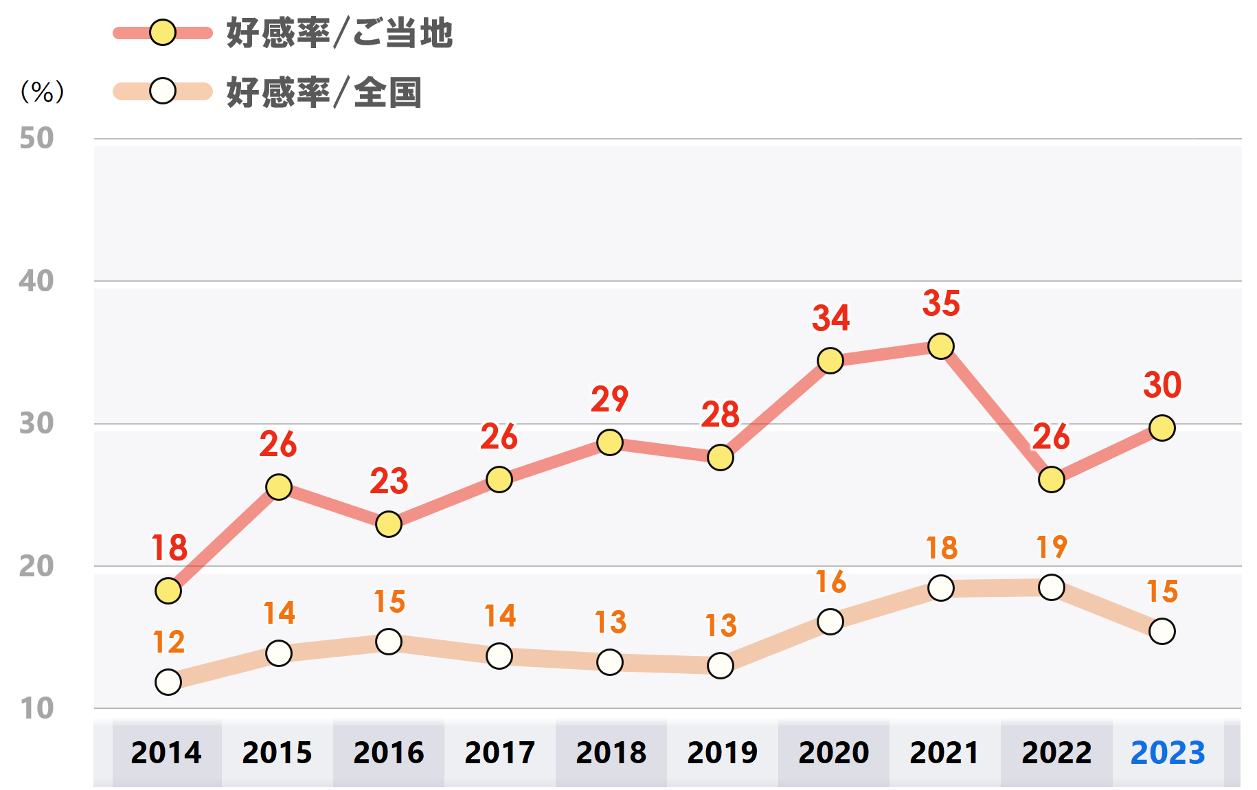・好感率の推移では、全国ベースで2014年は12%→2023年は15%と大きな変化はみられませんが、ご当地では2014年が18%だったのが、2023年は30%と10ポイント以上も増加しています。