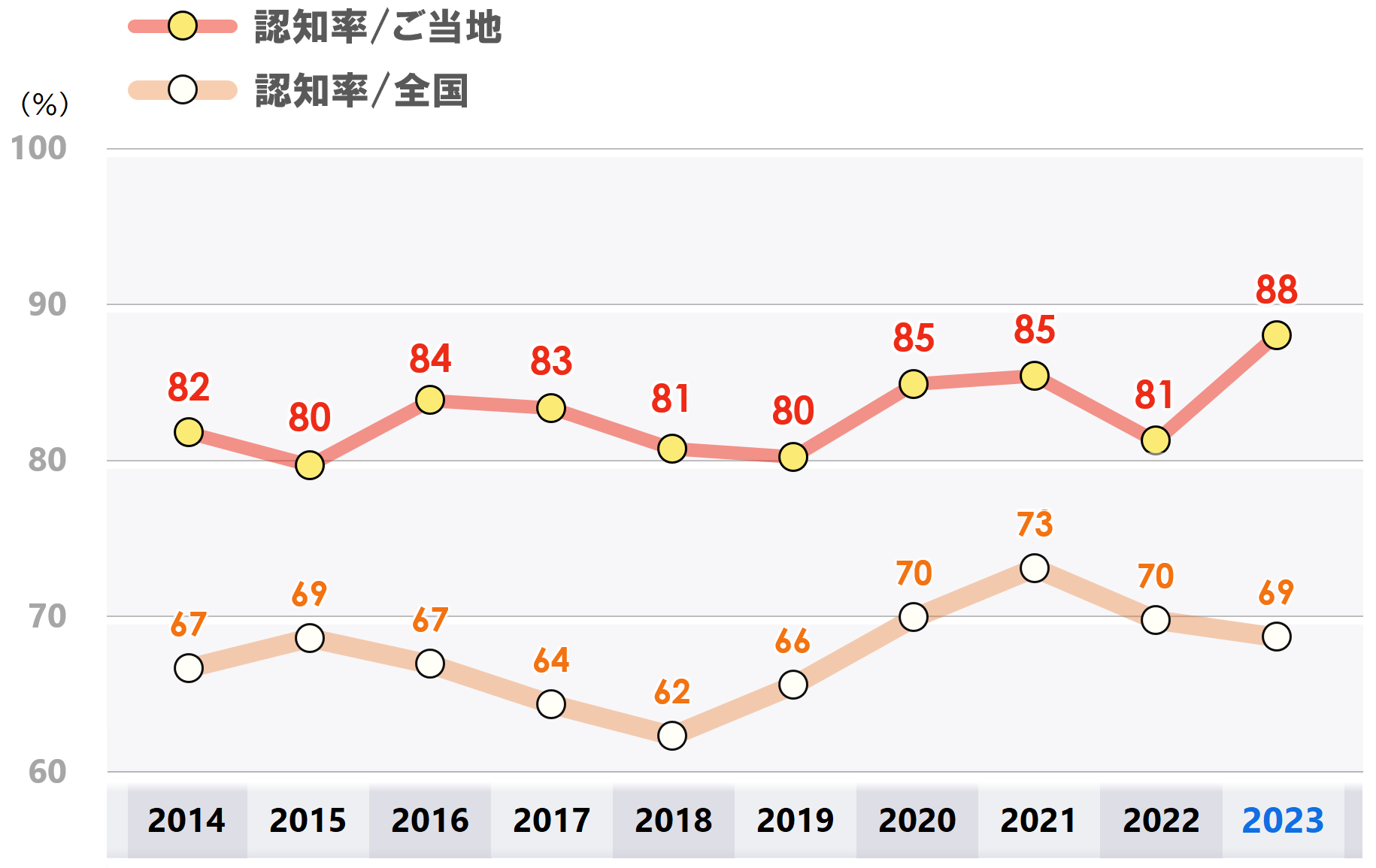 ・この10年間で多少の動きがあるものの、全国ベースでみると2014年は67%→2023年は69%、ご当地では2014年82%→2023年88%と、認知率はほぼ安定しています。