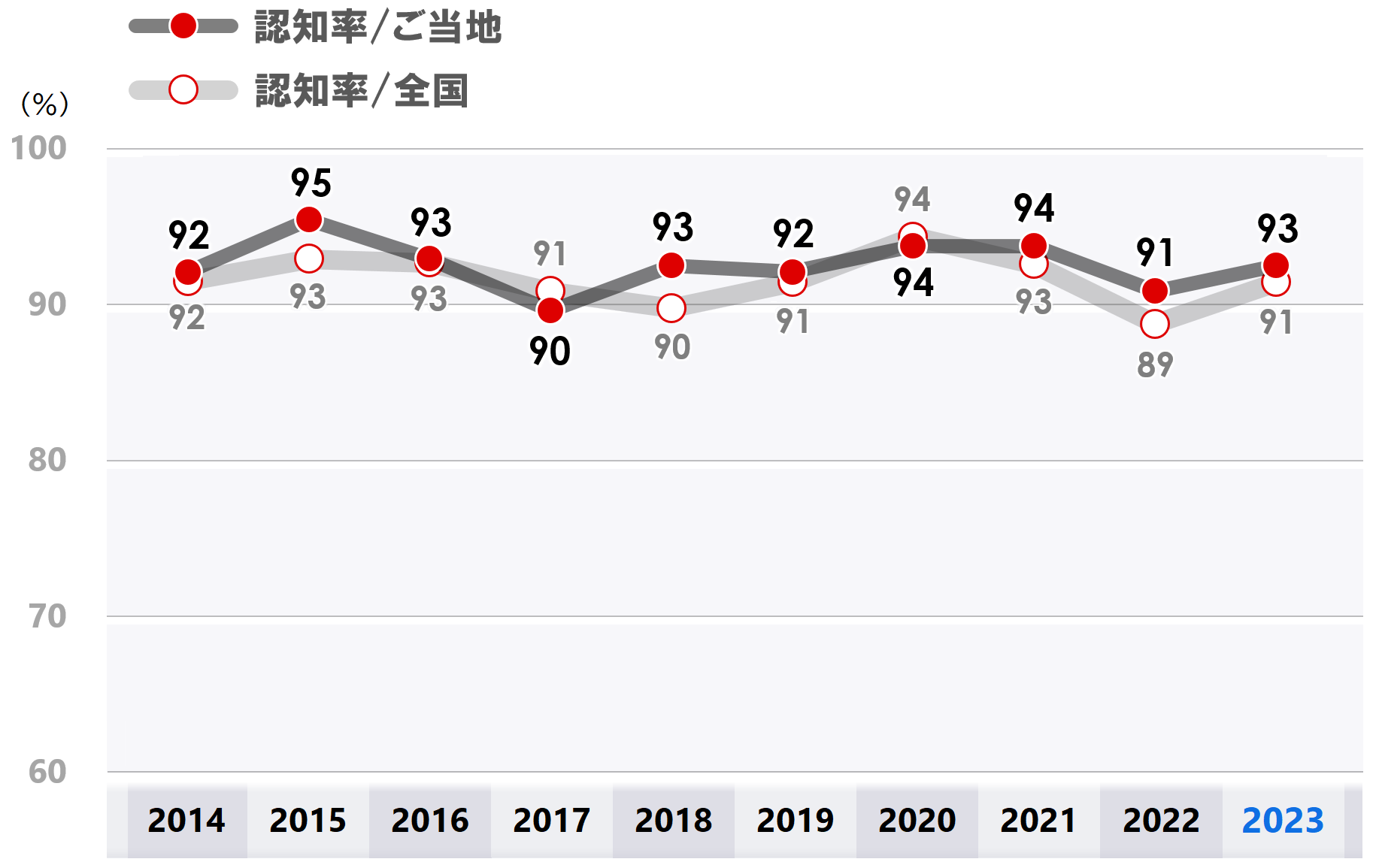・全国では87~92%、ご当地では90~95%と非常に高い認知率で推移しています。