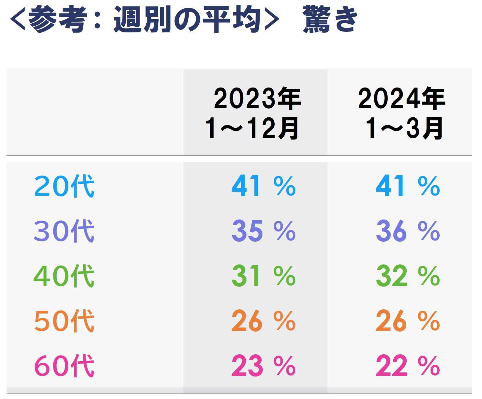 ・20代は、「驚き」「恐れ」「悲しみ」のいずれも1/1週に急上昇するような動きはみられず、他の年代層とは異なる傾向でした。