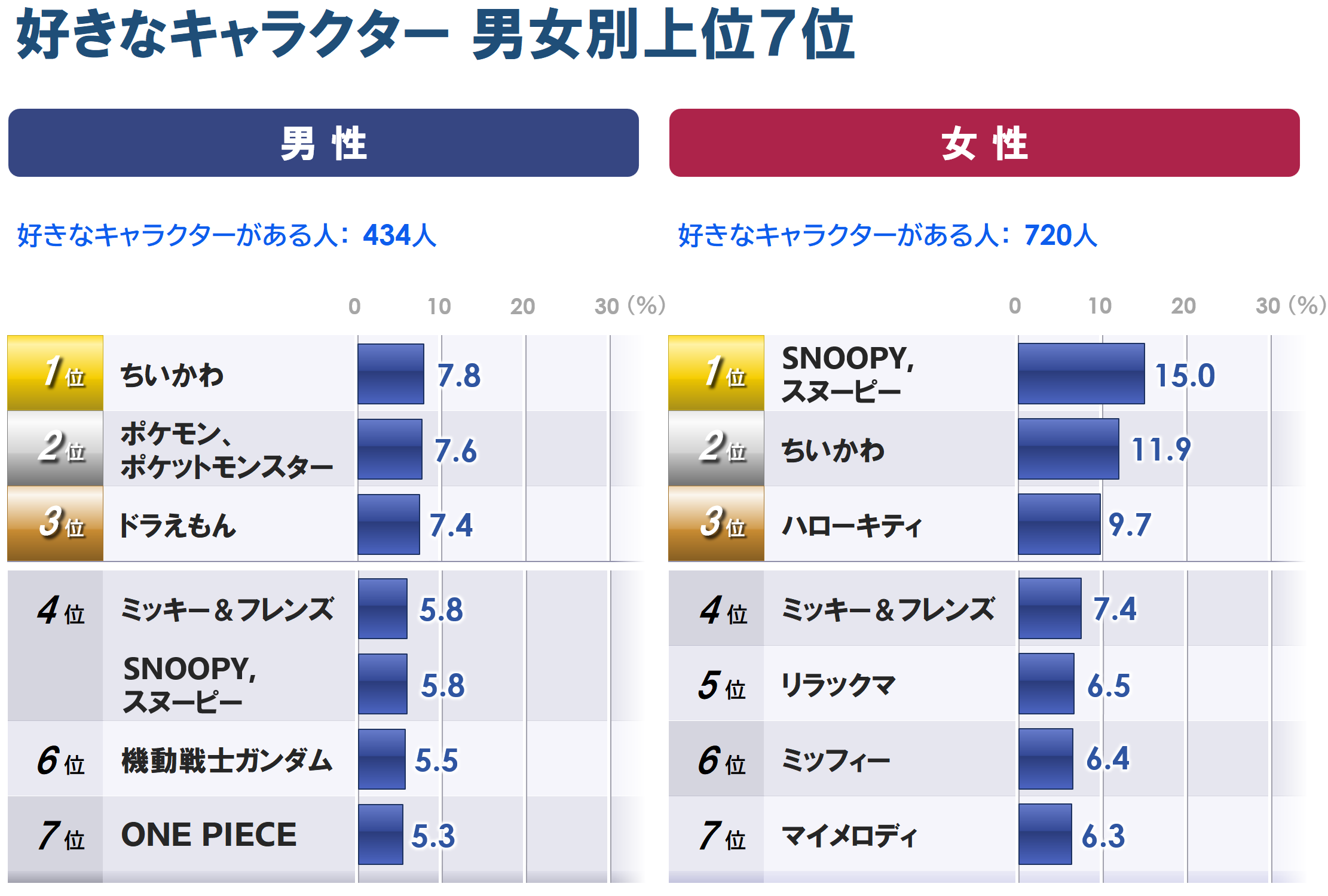 ・「ちいかわ」「SNOOPY」「ミッキー&フレンズ」は、男女ともに上位7位に入っているのは同じですが、男性では「ポケモン」「ドラえもん」、女性では「ハローキティ」が上位3位内と高い点が違っています。