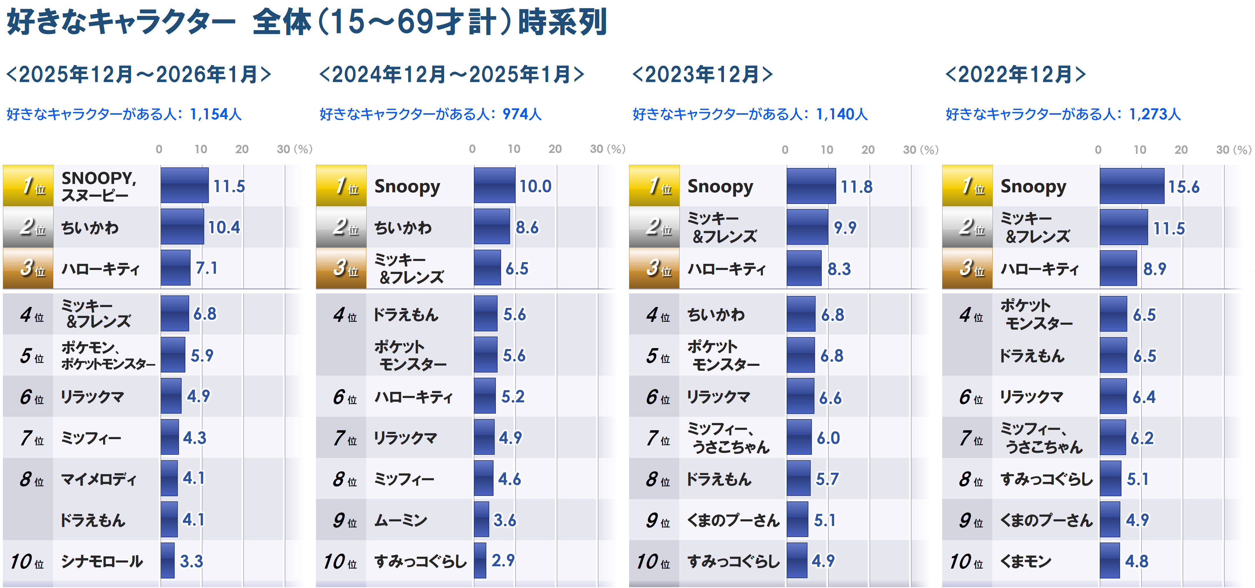 ・今回2位の「ちいかわ」は、前回調査(2024年12月~2025年1月)も2位でしたが、比率は8.6%→10.4%とアップしています。また2023年12月では4位、2022年12月では上位10位外でしたので、ここ数年で人気が上昇しているキャラクターです。